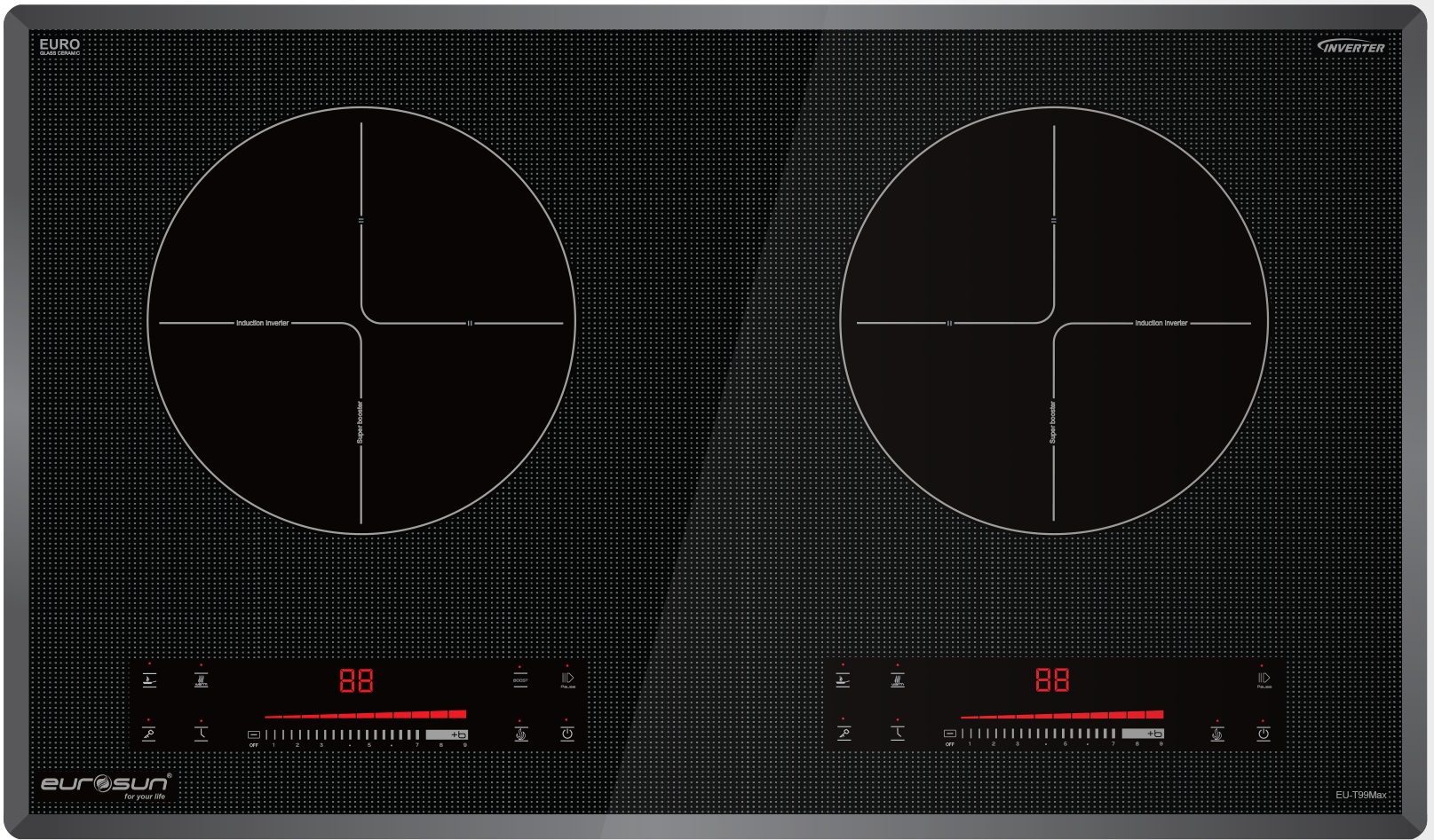 Bếp từ Erosun EU T99Max có tính năng đun nấu tiện lợi. Bảng điều khiển dạng trượt hiện đại với nhiều cấp độ nấu khác nhau. Công suất mỗi vùng là 2000W, booster đẩy công suất lên 2500W, với công suất này giúp món ăn được nhanh chín hơn, tiết kiệm thời gian cho người sử dụng. Thiết kế bảng điều khiển độc lập cho mỗi vùng nấu giúp người tiêu dùng dễ dàng điều chỉnh món ăn theo mức nhiệt phù hợp từng món nấu