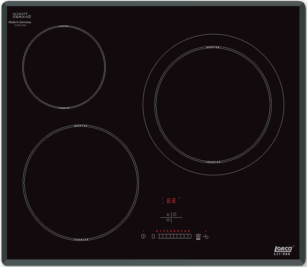- Bếp từ Locar LCI 360 thiết kế 03 vùng nấu với kích thước khác nhau giúp người tiêu dùng nấu ăn nhanh hơn, tiết kiệm thời gian hơn